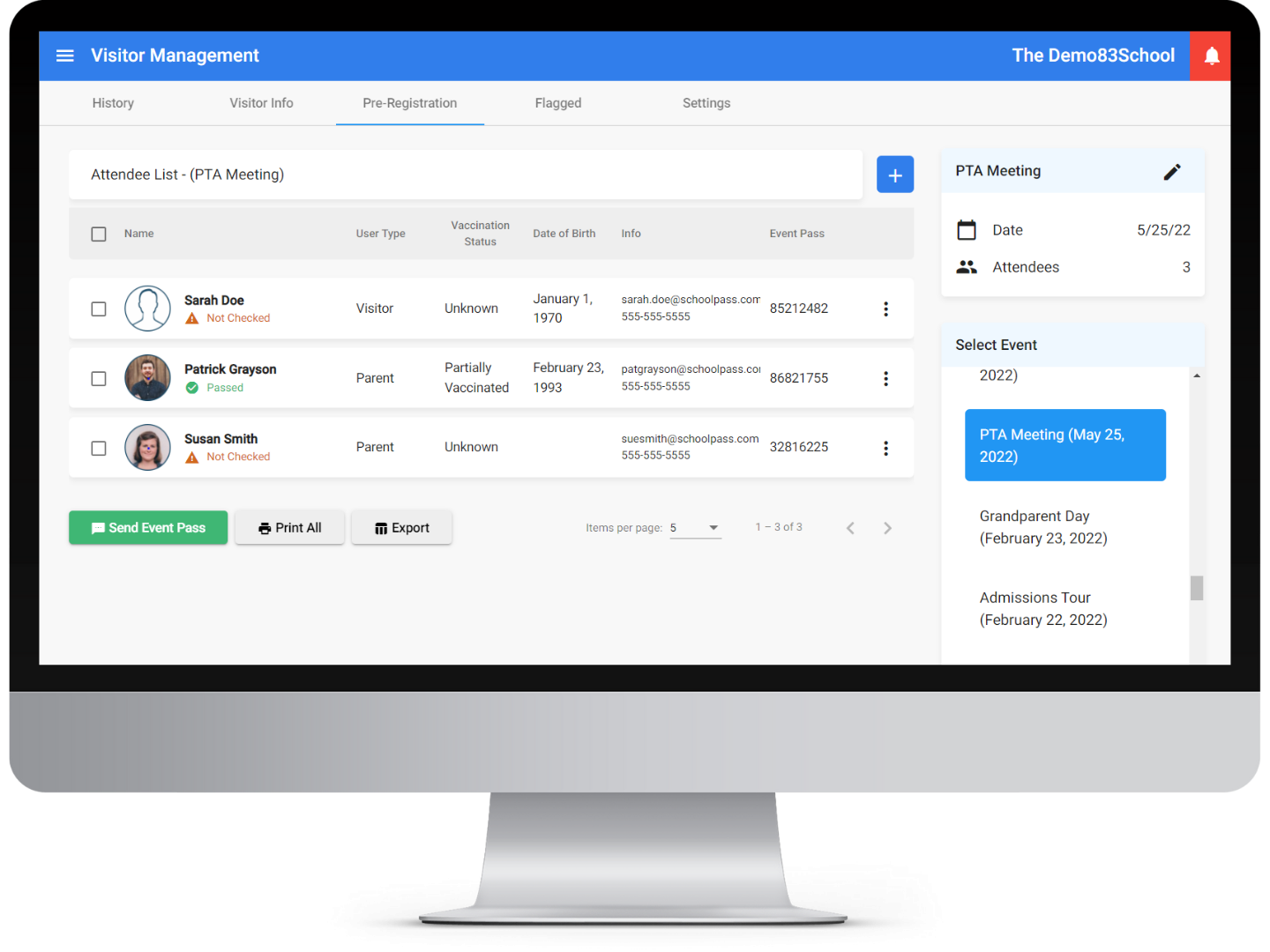 Simplify the verification of vaccinations at school activities by pre-registering attendees and allowing visitors to enter their vaccination status ahead of time. This allows schools that have criteria for parents or visitors coming on campus to collect information seamlessly through the SchoolPass app or online.